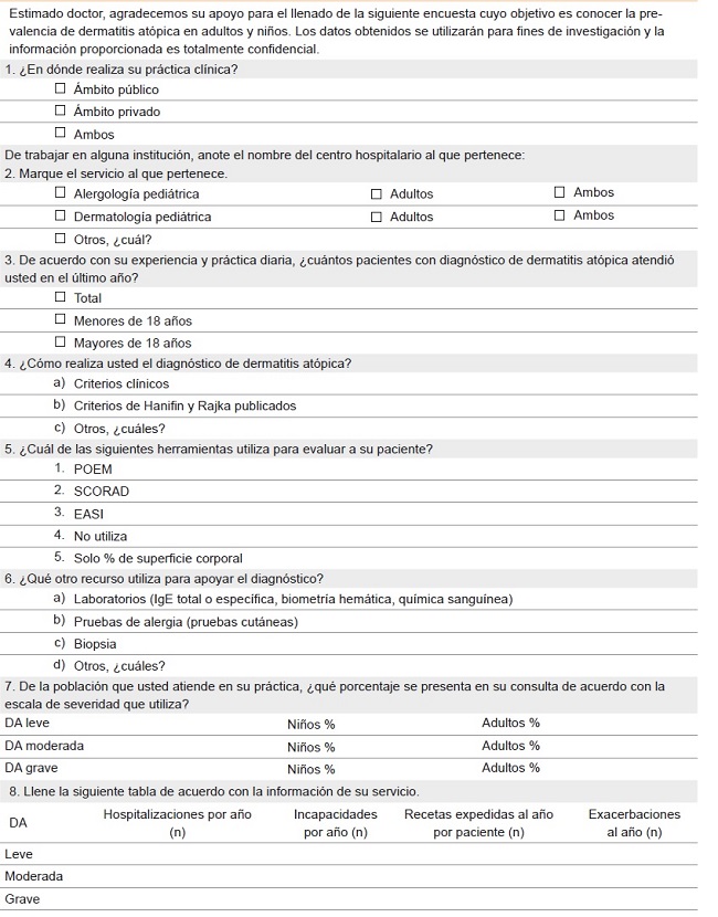 Se realizó un estudio observacional, descriptivo y transversal, autorizado por el comité de ética del Hospital Ángeles Clínica Londres, Ciudad de México, México, con número HACL 2018/004, mediante una encuesta electrónica (anexo 1) diseñada por los autores, cuyo objetivo fue conocer los criterios diagnósticos y tratamiento utilizados en DA por las especialistas de dermatología, alergología e inmunología clínica y pediatría de diferentes instituciones públicas de salud en México.