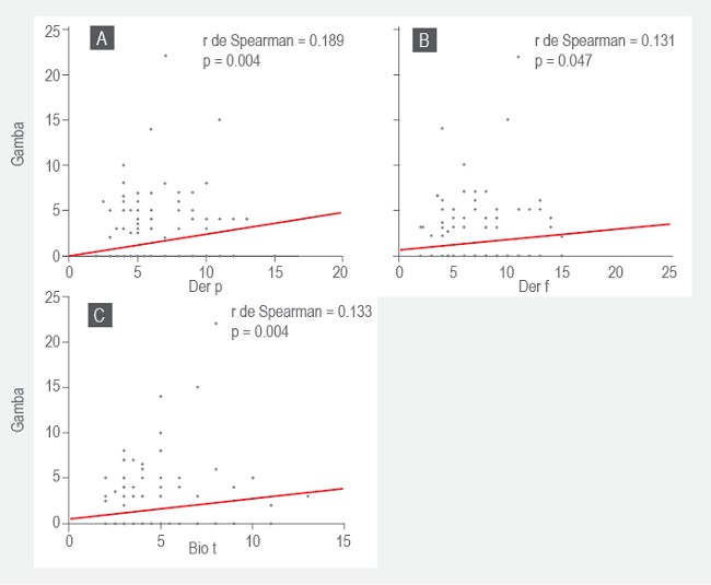 Al analizar la frecuencia de consumo previo de camarón, no se encontró una diferencia estadísticamente significativa en lo reportado por los pacientes sensibilizados a camarón (n = 26, 54.2 %) versus los pacientes no sensibilizados (n =90, 49.7 %), p = 0.584. Adicionalmente, se evaluó la correlación entre el tamaño de la erupción en la prueba cutánea de ácaros y de camarón, la cual fue débil pero estadísticamente significativa: mayor para Der p (figura 2).