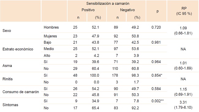 Para establecer la relación de los aspectos sociodemográficos y clínicos con la presencia de sensibilización a camarón y ácaros se aplicó chi cuadrada de independencia de Pearson, razón de verosimilitud o prueba exacta de Fisher; de igual manera, se evaluó la fuerza de relación por medio de la razón de prevalencia (RP) con sus respectivos intervalos de confianza de 95 % (IC 95 %).