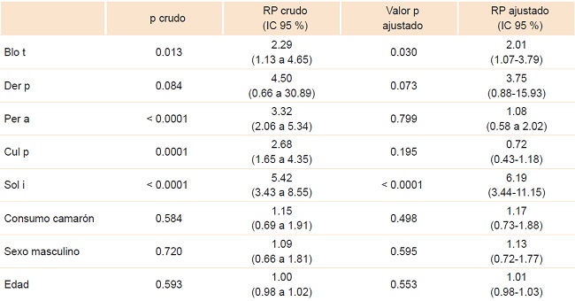 En el cuadro 2 se muestran los resultados del modelo multivariado para la prevalencia de sensibilización a camarón. Se encontró una relación estadísticamente significativa entre la sensibilización a Blo t y Sol i respecto a la sensibilización a camarón. De acuerdo con este modelo de interacción, es dos veces más probable que los pacientes con una prueba intraepidérmica positiva para Blo t reporten una sensibilización a camarón, respecto a aquellos que tiene prueba negativa (IC 95 % = 1.07-3.80), ajustando por las demás variables. En los pacientes con prueba de punción cutánea positiva a Sol i existió 6.19 veces más probabilidad de encontrar sensibilización positiva a camarón, en comparación con los pacientes que presentaron resultado negativo a Sol i (IC 95 % = 3.44-11.15).