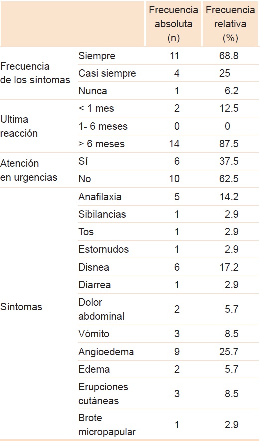 Todos los pacientes del estudio, tanto los casos como los controles, respondieron la encuesta, lo cual permitió establecer que de los 48 pacientes con prueba intraepidérmica positiva a camarón, 33 tenía indicación para la prueba de provocación oral. En 15 pacientes no estaba indicada la prueba debido a que, por historia clínica, ocho reportaban que habían ingerido camarón anteriormente sin presentar síntomas, la última ingesta en los seis meses previos, y siete tenían historia de reacción tras el consumo, cinco casos compatibles con anafilaxia (cuadro 3).