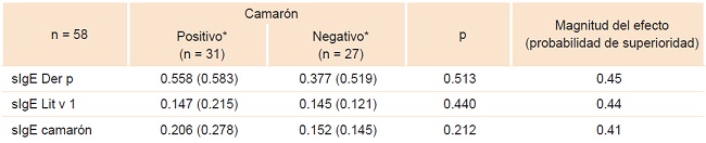 Resultados: De 229 pacientes, 48 (21%) se encontraban sensibilizados a camarón. No hubo diferencia estadísticamente significativa en la ingesta de camarón entre casos (54.2%) y controles (49.7%); ocho casos presentaron síntomas al contacto con camarón. No se encontraron diferencias estadísticamente significativas en la sIgE para Der p, Lit v1 y camarón entre casos y controles. Se observó cambio mediano en la magnitud de efecto: 0.45, 0.44 y 0.41, respectivamente.