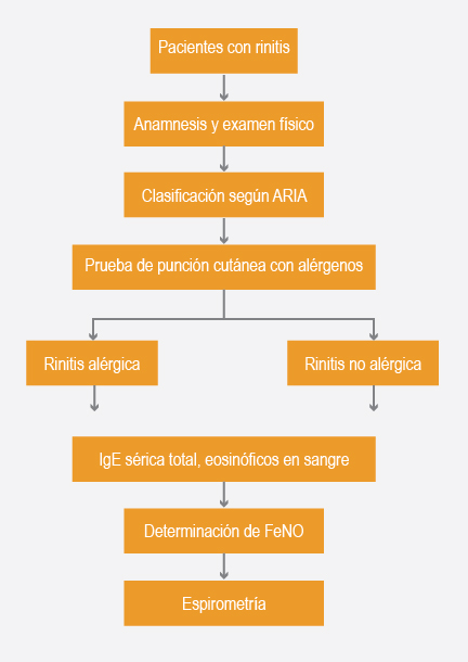 Se registró edad, sexo, talla, peso y duración de la rinitis. Se realizaron pruebas cutáneas con alérgenos de lectura inmediata por prueba de punción cutánea, espirometría por curva flujo-volumen, determinación de IgE sérica total y hemograma completo con medición de valores absolutos y relativos de eosinófilos en sangre. Se efectuó cuantificación de la FeNO y se clasificó la rinitis de acuerdo con los criterios de ARIA (Allergic Rhinitis and its Impacto on Asthma).
