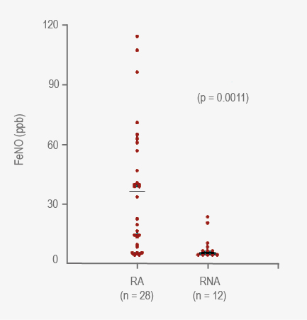 Los niños y adolescentes con RA de nuestro estudio tuvieron FeNO significativamente más elevado que los pacientes con RNA. El hallazgo se correlacionó significativamente con el recuento de eosinófilos hemáticos. La FeNO elevada estuvo asociada con función pulmonar alterada.