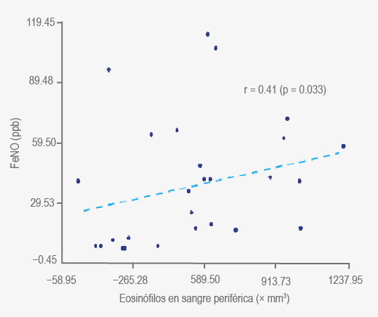 Se incluyeron 40 pacientes, 28 con RA y 12 con RNA (cuadro 1). Los pacientes con RA tuvieron niveles de FeNO más elevados (mediana 36.5 ppb, rango 5-114) que los RNA (mediana 7 ppb, rango 5-24) (p = 0.0011) (figura 2). Considerando valores de FeNO de 20 ppb como punto de corte, los pacientes con FeNO en valores intermedios y patológicos tuvieron mayor probabilidad de presentar función pulmonar anormal (RM = 7.14 [IC 95 % = 1.04-49.04]) (p = 0.049). No hubo diferencias de FeNO en relación con la frecuencia de los síntomas (p = 0.576) ni la gravedad de la rinitis (p = 0.168). En pacientes con RA se comprobó correlación positiva entre los valores de FeNO y los de eosinófilos en sangre periférica (r = 0.41, p = 0.033, figura 3). No hubo correlación entre FeNO con IgE sérica total (r = 0.24, p = 0.21) en RA ni entre FeNO versus eosinófilos sangre (r = 0.02, p = 0.96) y FeNO versus IgE en el grupo con RNA (r = 0.32, p = 0.34).