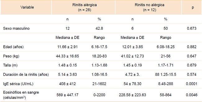 Estudio transversal, observacional analítico, en el que se incluyeron de forma sucesiva niños y adolescentes de uno u otro sexo, entre seis y 18 años, con diagnóstico de rinitis basado en la presencia de dos o más síntomas nasales característicos (rinorrea, obstrucción nasal, prurito y estornudos).1 Los pacientes fueron categorizados con RA y RNA, de acuerdo con la presencia o no de sensibilidad a aeroalérgenos determinada por pruebas cutáneas por punción.17 Se excluyeron los pacientes con las siguientes condiciones: