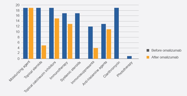 In the last scheduled visit, all patients were on moisturizing agents, 15 patients were using topical tacrolimus in specific skin regions; 5 patients were using daily topical steroids, 6 patients were using it occasionally, 4 did not require topical steroids, and 4 did not specify dosing. None of the patients was using systemic steroids. Four patients were taking systemic immunosuppressant agents other than steroids for symptom control; 3 of them were taking azathioprine and 1 was taking cyclosporine. In addition, 13 patients were using immunotherapy only for dust mites and 2 patients were using it for grasses and dust mites. The different frequencies between treatment regimes before and after omalizumab are shown in figure 1. No serious adverse events were reported with the use of omalizumab.