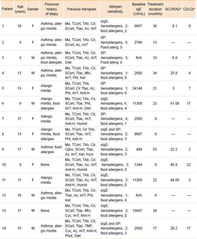 Methods: A retrospective review of the cases of pediatric patients with severe atopic dermatitis who were treated with omalizumab as an adjuvant therapy in an outside allergy service. Patients under 18 who had been treated for at least 6 months were included.