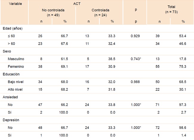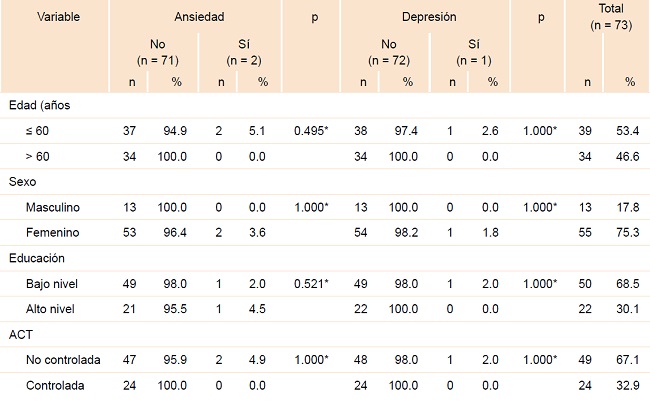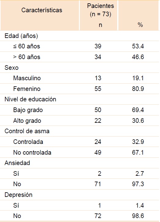Resultados: De 73 pacientes, 55 (80.9%) eran mujeres y 50 (69.4%) tenían nivel educativo bajo; 49 (67.1%) tuvieron asma no controlada (p = 0.005). Pocos pacientes presentaron síntomas de ansiedad (2.7%) y depresión (1.4%) (p = 0.000). Los factores asociados con mayor proporción de ansiedad y depresión fueron edad ≤ 60 años, sexo femenino y asma no controlada. No hubo correlación significativa entre el control del asma y la puntuación de ansiedad o depresión.
