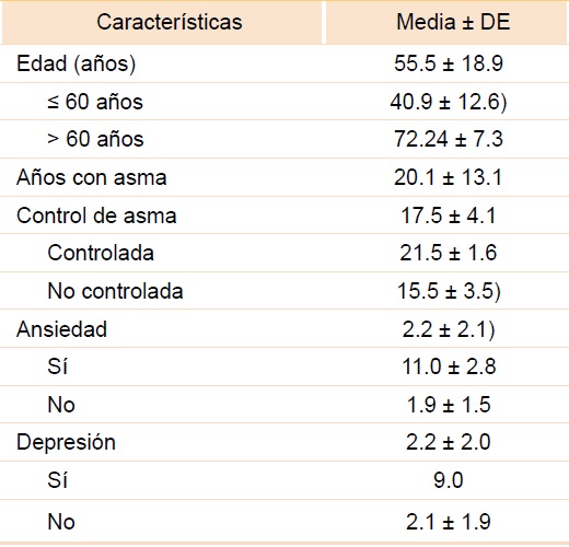 Los pacientes con edad ≤ 60 años, de sexo femenino y con asma no controlada presentaron mayor frecuencia de ansiedad y depresión. En los pacientes de alto nivel académico se observó mayor proporción de ansiedad y ningún caso de depresión en comparación con los de nivel académico bajo (cuadro 3).