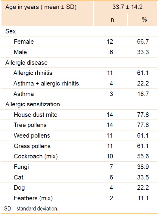 We analyzed the data of 257 adults with allergic respiratory diseases; exclusively with allergic rhinitis were 158, asthma without allergic rhinitis were 28 and asthma with allergic rhinitis were 72; in which the frequency for peanut sensitization (n = 18) was 7.0% (95% CI = 3.9-10.1), the mean age for this group was 33.7 ± 14.2 years; there was a greater prevalence in women than in men with a 2:1 ratio (table 1). In the peanut sensitization group, a little over 60% of the patients have allergic rhinitis. In addition to peanut sensitization, almost 80% of the patients were also sensitized to indoor dust mites or one of the tree pollens.