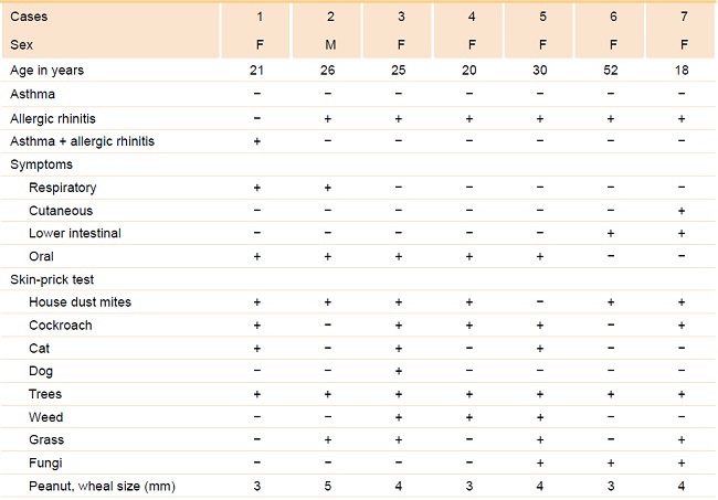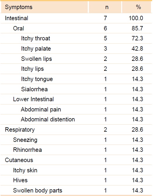 The prevalence of individuals with peanut allergy (7/257) was 2.7% (95% CI = 0.7-4.7). In this case, the mean age was 27.4 ± 11.6 years; in total, there were six women and one man out of all the cases. Among these patients, gastro-intestinal symptoms and those around the oral area were the most predominant, such as: an itchy throat and palate, followed by swelling of the lips; among the respiratory symptoms, the most common were sneezing and rhinorrhea; cutaneous symptoms were the least prevalent (table 2).