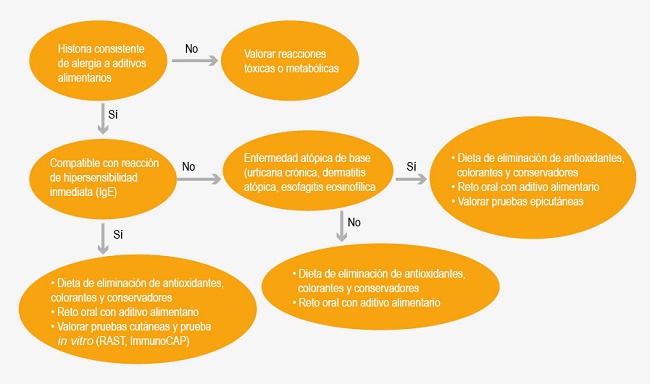 El diagnóstico de reacciones de hipersensibilidad secundaria a aditivos alimentarios es un potencial reto basado principalmente en la sospecha de asociación entre una entidad clínica (anafilaxia, asma, urticaria, rinitis) y el consumo de un aditivo alimentario y, por ende, su reporte suele ser anecdótico. Al tratarse en su mayoría de reacciones de hipersensibilidad no mediadas por IgE, los estudios de hipersensibilidad inmediata como pruebas cutáneas o IgE específico (ImmunoCAP, RAST) tienen utilidad limitada diagnóstica y solo pueden servir como herramienta de apoyo.