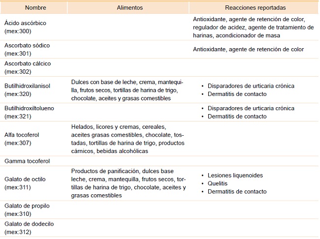 En varios estudios de asociación se ha demostrado cómo el aumento en la ingesta de antioxidantes fenólicos se ha correlacionado con aumento en la frecuencia de enfermedades alérgicas, mientras que la ingesta de flavonoides podría ejercer un efecto protector en el desarrollo de enfermedades alérgicas. Los principales antioxidantes en los cuales se han encontrado asociación con enfermedades alérgicas son el hidroxianisol butilado y el hidroxitolueno butilado, asociados con urticaria crónica hasta en 10 a 15 %. Del mismo modo se han reportado casos aislados de dermatitis de contacto, vasculitis cutánea y exacerbación de dermatitis atópica con el uso de estos antioxidantes (cuadro 1).10,11,12,13