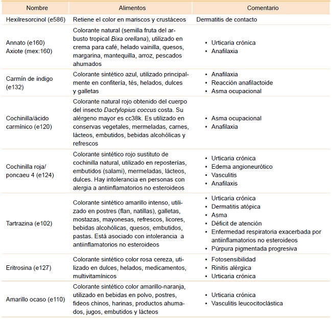 Los colorantes se pueden clasificar según su origen en naturales, sintéticos y minerales. Los colorantes sintéticos se dividen en azoicos (tartrazina, amarillo naranja, rojo cochinilla) y no azoicos (eritrosina, amarillo quinoleína e indigosina). Los colorantes naturales son menos frecuentes en reacciones de hipersensibilidad, sin embargo, han demostrado ser reacciones mediadas por IgE con el involucro de un alérgeno determinado (carmina: CCK 83; annato: proteína de annato) y se han reportado reacciones severas (anafilaxia), en tanto que los colorantes sintéticos están más asociados con reacciones de hipersensibilidad no IgE, en su mayoría leves, como urticaria crónica, angioedema y asma, exacerbación dermatitis atópica (cuadro 2).14,15,16,17,18
