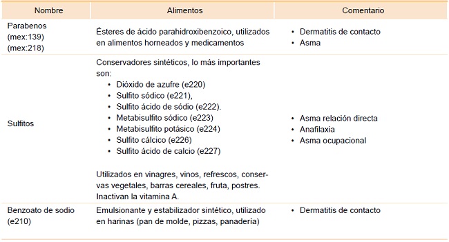El ácido benzoico es un conservador con propiedades antimicrobianas (bacterias y hongos) que se encuentra en su forma natural en algunas frutas y especias (canela, ciruelas, arándanos y frutos rojos); es utilizado en su forma artificial en forma de benzoato de sodio por su mayor solubilidad acuosa en la industria alimentaria en la preparación de mermeladas, gelatinas, jugos de frutas y en la industria farmacéutica y cosméticos. Las reacciones de hipersensibilidad a benzoatos se han reportado desde granulomatosis orofacial, urticaria crónica y asma bronquial (cuadro 3).19,20,21,22