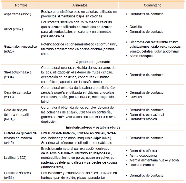 Los emulsificadores son sustancias que forman o mantienen una emulsión uniforme en un producto. El de mayor importancia respecto a reacciones de hipersensibilidad es la lecitina, la cual es extraída de la soya y conserva proteínas de esta, si bien hasta el momento no se ha reportado reactividad cruzada dado que lo niveles utilizados de estos aditivos son muy bajos en la mayoría de los alimentos. En su uso se han reportado casos de asma ocupacional, dermatitis de contacto, exacerbación de dermatitis atópica y urticaria crónica (cuadro 4).29