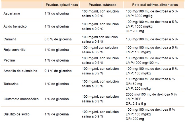 Por lo anterior, la prueba estándar de oro para reacciones de hipersensibilidad a aditivos alimentarios es el reto oral doble ciego placebo a aditivos alimentarios posterior a una dieta de exclusión de los mismos.35
