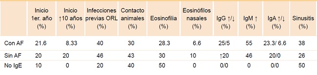 El primer grupo fue el más numeroso, con predisposición alérgica familiar, inicio precoz, la mayoría antes de los 10 años de edad y menor contacto con animales, sin otras diferencias destacadas. Por otra parte, fueron pocos los casos sin elevación de IgE; aunque en nueve existían antecedentes familiares de atopia, la eosinofilia fue superior en los otros grupos, al contrario que con las demás inmunoglobulinas, cuyos valores estuvieron dentro de los valores normales. Por otra parte, en este grupo, la sinupatía fue más frecuente. Además, aunque no se describe en el cuadro, en los tres grupos el ejercicio físico (asma por ejercicio) fue un desencadenante importante. En los tres grupos se observó sensibilización a ácaros del polvo (Dermatophagoides pteronyssinus y Dermatophagoides farinae), presentes especialmente en almohadas ya que se alimentan de la descamación y la caspa. Algunos pacientes también presentaban sensibilización a pólenes u hongos.