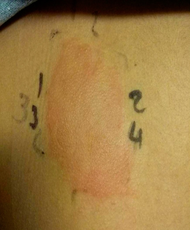 An 8 year old boy with fever and a sore throat was diagnosed with acute tonsillopharyngitis, and treatment with amoxicillin was started (it had been previously well tolerated). One day later, he presented bilateral malar rash which evolved to generalized erythroderma in two days, with joint inflammation and a persistent fever. He was referred to the emergency room and then he was discharged after the treatment with amoxicillin was discontinued. Five days later, the patient still had a fever (39 °C) and increasing erythroderma, and he also presented progressive facial and acral edema, and linear ecchymotic lesions in the neck, armpits and groin. His body weight increased 1.2 kilograms in 2 days. The laboratory studies showed 6220 leukocytes/mm3 (970 eosinophils/mm3), with normal liver and renal function (alanine aminotransferase 19 IU/L, urea 17 mg/dL, creatinine 0.33 mg/dL). The pharyngeal culture tested positive to human herpesvirus 6 (HHV-6) (127.527 copies/100 cells by polymerase chain reaction). The patient was admitted in the hospital for two days, during which the fever, rash and edema disappeared with supportive measures Ten days later, his blood tests were normalized (8150 leukocytes/mm3, 430 eosinophils/mm3). Specific IgE to penicillin G, penicillin V, ampicillin and amoxicillin was < 0.1 kU/L. An immediate reading of the skin prick test and the intradermal test (IDT) to benzylpenicilloyl-polylysine (PPL), minor determinant mixture (MDM), ampicillin (20 mg/mL), amoxicillin (20mg/mL) and cefuroxime (25 mg/mL), turned out to be negative. A delayed reading of IDT (48 hours) tested positive to ampicillin (4 mm) and amoxicillin (6 mm), but negative to cefuroxime (0 mm). A patch test (with vaseline) turned out to be positive to amoxicillin 10% (+), ampicillin 10% (+), cefuroxime 20% (+), and amoxicillin-clavulanic acid 10% (+), but it tested negative to cefuroxime 10% (−) at 48 and 96 hours (figure 1). According to these results, our patient was diagnosed with delayed reaction to aminopenicillin; and the recommendation was to avoid penicillin altogether.