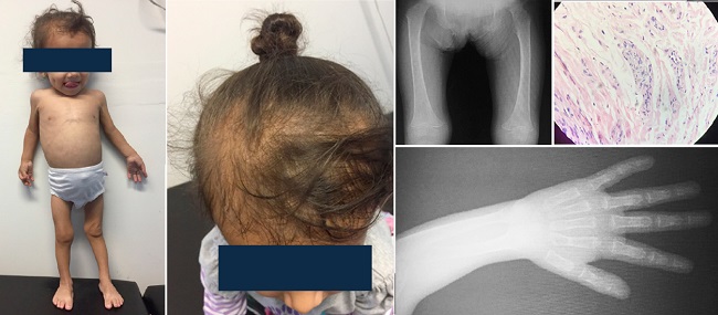 Clínicamente los pacientes padecen condrodisplasia metafisaria, caracterizadas por la forma y distribución del cabello (fino, corto, fácilmente quebrantable y ligeramente claro),4,10 entre otras.