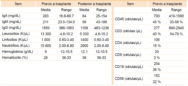 Si los pacientes presentan alteraciones inmunológicas humorales se recomienda gammaglobulina intravenosa,4 que disminuye la frecuencia de infecciones pero sin impacto en el desarrollo esquelético. El único tratamiento curativo es el trasplante alogénico de células hematopoyéticas,5,7,13 que fue realizado a la paciente descrita, quien obtuvo buenos resultados.