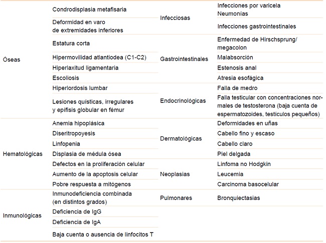 Se ha considerado que la gravedad de la inmunodeficiencia se corresponde con el grado de anemia y falla de medro, no así con la afección esquelética.2,8 La inmunodeficiencia se caracteriza por ausencia y disminución de células T o alteraciones en la función, además de defectos en el ciclo de las células y apoptosis incrementada, en especial en el desarrollo tímico.2,7,8,10 Los pacientes con afectación grave presentan inmunodeficiencia combinada severa con fenotipo característico T−B+/−NK+.7,8