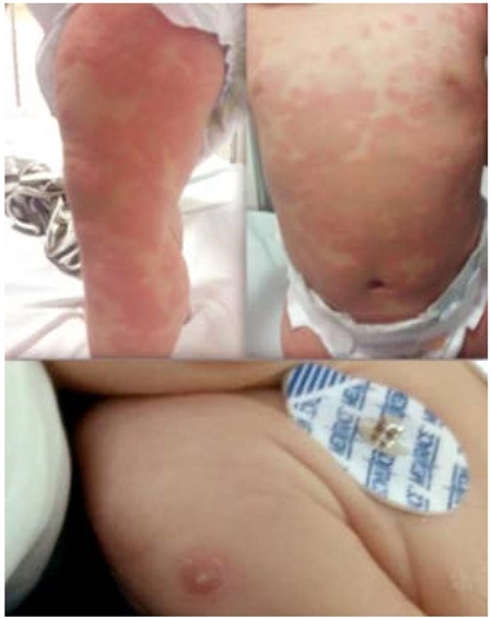 Se inició reanimación hídrica con 20 mL/kg/dosis de solución cristaloide, cefotaxima, metronidazol e inotrópico por sepsis grave con foco abdominal. Al estabilizar al paciente se observó exantema urticariforme en tórax, abdomen y extremidades inferiores, eritema en zona de aplicación de la vacuna BCG (figura 1), eritema y edema palmoplantar, así como hipoventilación basal bilateral a la auscultación torácica. Los estudios de laboratorio mostraron leucocitosis (18 070 células/mm3), segmentados de 70 %, anemia microcítica normocrómica (hemoglobina de 9.2 g/dL, volumen corpuscular medio de 75.1 fL, MCH de 24.9 pg), trombocitopenia (65 000/mm3), proteína C reactiva (PCR) de 14.62 mg/dL, leucocituria e hipoalbuminemia (2.9 g/dL). En la radiografía de tórax se observó infiltrado intersticial bilateral y con la punción lumbar se obtuvieron los siguientes resultados: 44 células/mm3 (50 % de polimorfonucleares neutrófilos humano), glucosa de 68 mg/dL, proteínas de 41.2 mg/dL, tinción de Gram y coaglutinación negativa.