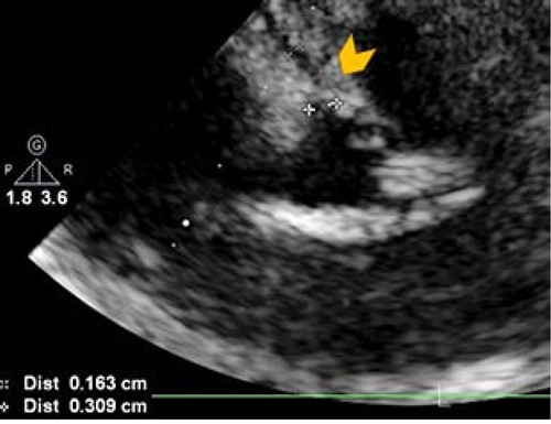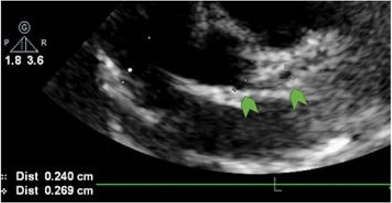 Por los hallazgos clínicos y de laboratorio se sospechó SCEK (cuadro 1), por lo que se administró inmunoglobulina intravenosa (2 g/kg/dosis), 30 mg/kg/dosis de metilprednisolona y 50 mg/kg/día de ácido acetil salicílico. El ecocardiograma demostró dilatación de la arteria coronaria derecha (CD) con índice Z de +3.87, y del origen de la descendente anterior izquierda (DA) con índice Z de +3.47 (figura 2); se apreció taquicardia sinusal. La evolución clínica fue favorable con remisión de la fiebre a las 24 horas.