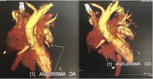 El paciente fue egresado al quinto día con dosis de 0.5 mg/kg/día de prednisona y 5 mg/kg/día de ácido acetil salicílico. El ecocardiograma a las dos semanas reportó incremento de las lesiones en ambas arterias coronarias, CD con índice Z +16, coronaria izquierda (CI) con índice Z +8, DA con índice Z +9 y Cx de 3.1 mm (figura 3). La angiotomografía (figura 4) mostró tres aneurismas, dos de los cuales eran fusiformes localizados en DA (3.5 mm) y de origen en la Cx (2.5 mm), catalogados como medianos; además de un aneurisma gigante de la CD (7 mm). Con estos hallazgos se agregó anticoagulación con 1 mg/kg/día de enoxaparina subcutánea. Actualmente el paciente se encuentra asintomático con persistencia de las lesiones coronarias descritas.