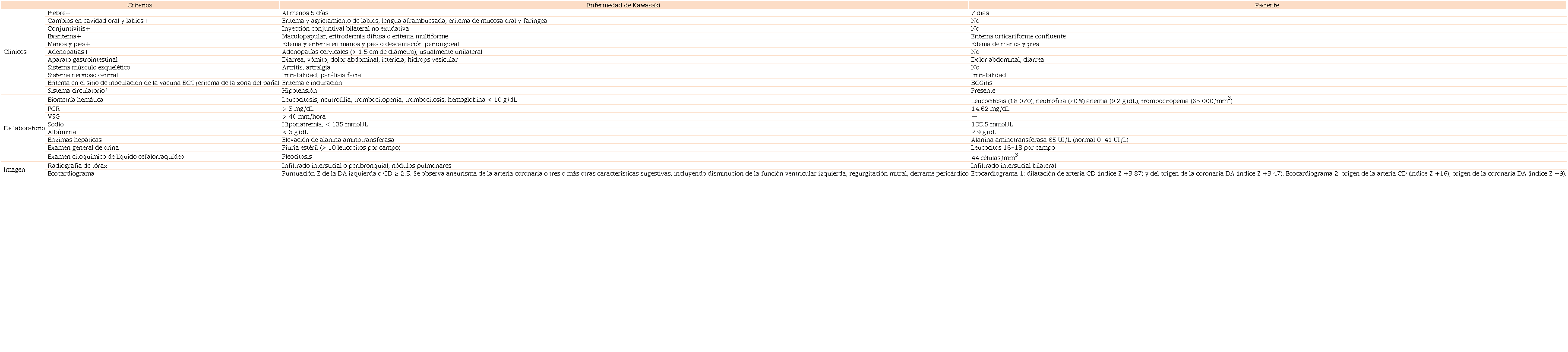 Caso clínico: Varón de cinco meses de edad con fiebre de una semana de evolución, síntomas gastrointestinales y neurológicos con choque hipotensivo, erupciones urticariforme, linfadenitis por vacunación con bacilo de Calmette-Guérin, así como edema de manos y pies. Se evidenciaron aneurismas coronarios gigantes, por lo que se diagnosticó síndrome de choque por enfermedad de Kawasaki, el cual fue tratado con pulso de corticoesteroide e inmunoglobulina intravenosa.