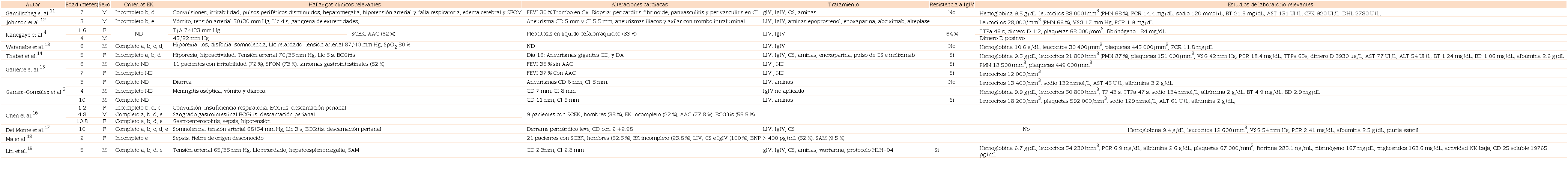 En 2009, Kanegaye et al. describieron el SCEK: 7 % de los individuos con EK desarrollaron hipotensión arterial sistólica para la edad, disminución sostenida de la presión arterial sistólica desde el inicio ≥ 20 % o signos clínicos de hipoperfusión.4 Gámez-González et al. realizaron la descripción de los casos y series publicadas hasta 2017; en total registraron 103 pacientes con edad media al diagnóstico de 62.6 meses, EK incompleta (32 %), manifestaciones atípicas (45.6 %), síntomas gastrointestinales (74.6 %), anormalidades en arterias coronarias (72.8 %), con una relación estadísticamente significativa del sexo masculino, resistencia a la inmunoglobulina intravenosa (49 %), uso de inotrópicos, insuficiencia cardiaca, dolor abdominal y manifestaciones neurológicas; respecto a los hallazgos de laboratorio registraron hipoalbuminemia, hiponatremia e insuficiencia hepática. La presencia de aneurismas gigantes se reportó en 4.8 % y la mortalidad, en 6.8 %.10 El cuadro 2 describe los casos de SCEK en menores de 12 meses, 53 % varones, 46.6 % EK incompletos, anormalidades de las arterias coronarias 72.7 % (8/11), leucocitosis, anemia, trombocitopenia, velocidad de sedimentación globular y PCR elevadas e hipoalbuminemia como los hallazgos constantes. También se registraron síntomas neurológicos y gastrointestinales; como manifestaciones iniciales, aneurismas gigantes (> 8 mm), síndrome de activación macrofágica, así como una defunción.3,11,12,13,14,15,16,17,18,19 Los primeros dos casos se registraron antes de que se definiera el SCEK, si bien se cumplieron los criterios diagnósticos.
