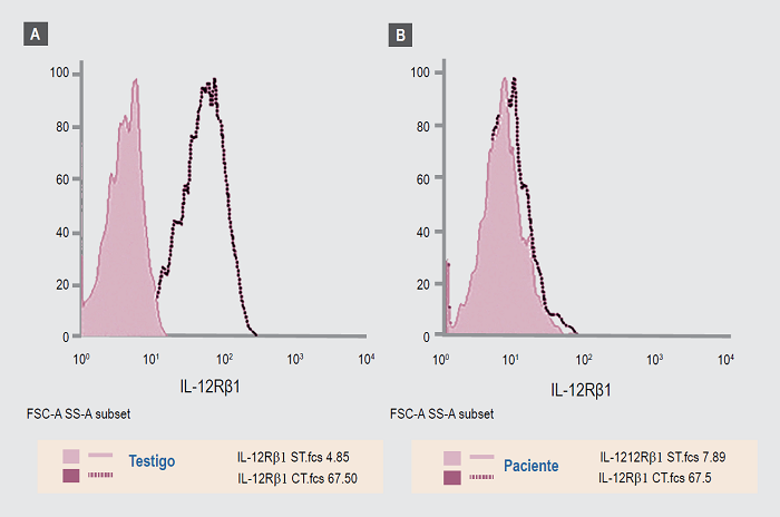 Debido a infección diseminada por Mycobacterium bovis, cepa vacunal, sin respuesta a tratamiento y al excluir otras causas, se sospechó un defecto de la inmunidad mediada por el IFN-γ, específicamente una deficiencia de IL-12Rβ1, por la presencia de vasculitis leucocitoclástica y candidiasis oral crónica. Para descartar este defecto, las células mononucleares de la paciente y de un testigo sano se cultivaron con fitohematoaglutinina; 48 horas después se cuantificó el receptor IL-12Rβ1 por citometría de flujo. La paciente no expresó el receptor IL-12Rβ1 en dos pruebas (Figura 2).