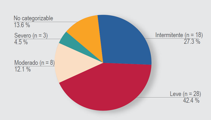 La media de edad de los pacientes con asma fue 66 ± 15 años y 62 % (n = 41) perteneció al sexo femenino. En el Cuadro 1 se describen las características basales de la población con asma: 55 % tuvo diagnóstico de asma en la adultez, 21 % en la niñez, la media de edad al diagnóstico fue 51 ± 20 años y de aquellos con asma grave de 68 ± 15 años. En la Figura 1 se describe la clasificación del asma de los pacientes con dicha patología.