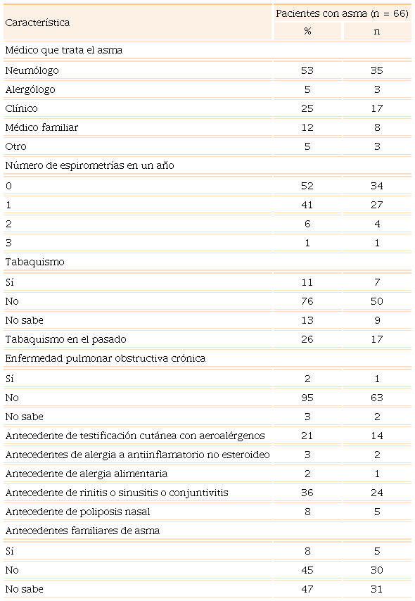 El 81 % de los pacientes tuvo un apego aceptable al tratamiento, determinado por el consumo permanente de fármacos para tratar el asma, a pesar de lo cual fue considerable el uso de corticoides orales (29 %); 23 % empleó salbutamol como rescate, al menos una vez al año; una tercera parte de los pacientes con asma presentó rinitis y un porcentaje similar eosinofilia, a pesar de lo cual observamos una escasa valoración alergológica; 52 % no se realizó espirometría al menos una vez por año.