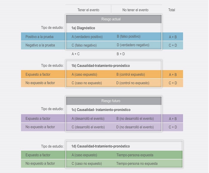 Como parte del proceso de atención de cualquier paciente, los médicos buscan conocer si una persona tiene o no una enfermedad (proceso diagnóstico), si es posible tomar medidas para revertir el problema (ofrecer tratamiento), o bien, prever el desenlace a futuro (pronosticar qué le sucederá al paciente, como la curación). En estos dilemas, los médicos lidian con cierto grado de incertidumbre, misma que definimos como “riesgo”. Al respecto, la Real Academia de la Lengua Española define el riesgo como “contingencia o proximidad a un daño”; precisamente, la condición en la atención médica implica esto. Prácticamente, la forma de estimar el riesgo es a través de probabilidades, las cuales pueden ser emitidas por el método frecuentista (porcentaje o número de veces que sucede un evento, dividido entre el número de intentos) o bayesiano (percepción o proporción de veracidad).6 Debido a que la forma frecuentista es la más usada en la literatura médico-científica, es la que se presentará a continuación.