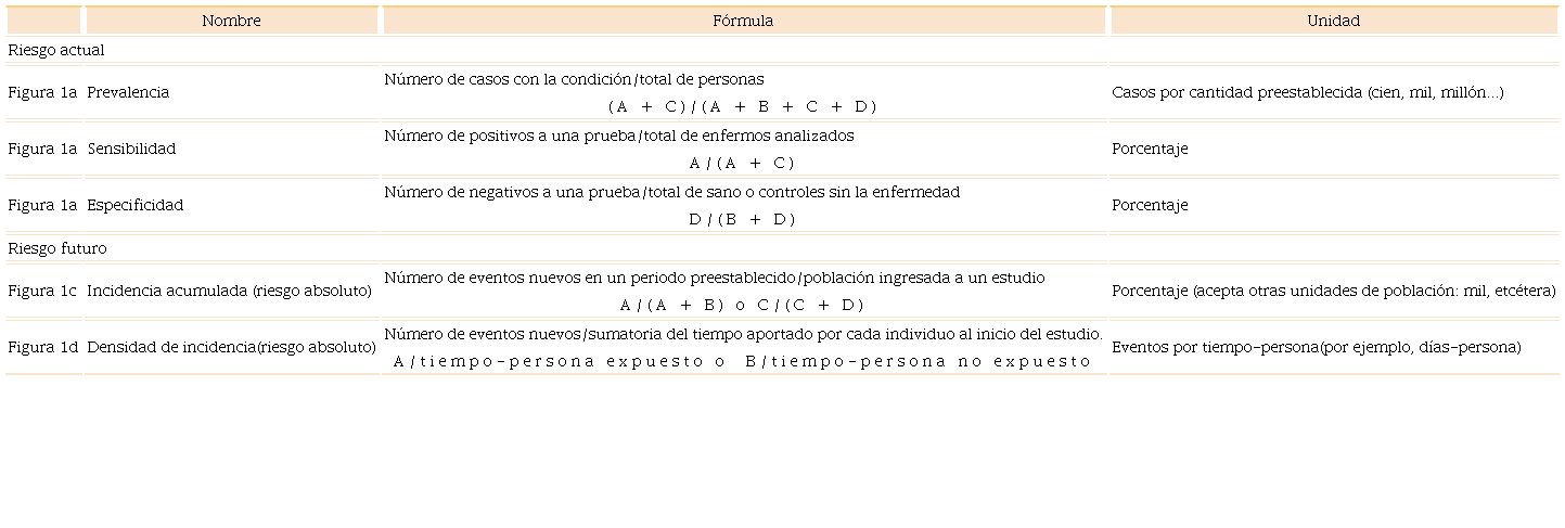 Partiendo de que, en el ámbito clínico, los ejes de la atención son el diagnóstico, tratamiento, pronóstico y la búsqueda de factores de riesgo para el desarrollo de enfermedades, este artículo tiene como objetivo mostrar, mediante ejemplos, los conceptos necesarios para la compresión y uso de las medidas de riesgo, de asociación y de impacto. Para hacer el discurso más amigable, en los ejemplos se trató de evitar la utilización de fórmulas, las cuales pueden ser consultadas en textos especializados,1,3 pero también están sintetizadas en la Figura 1.
