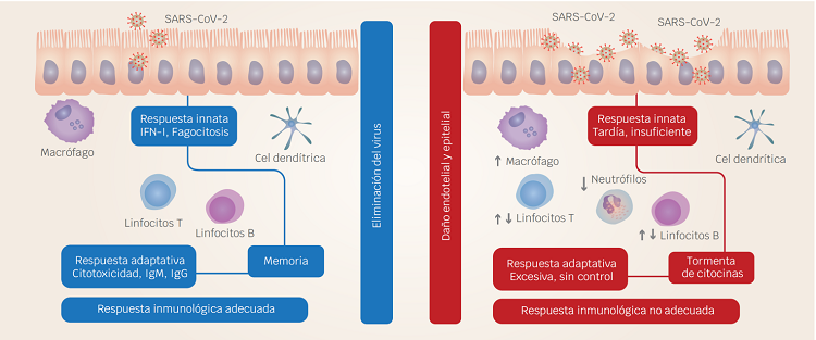 El tratamiento farmacológico de la urticaria y el angioedema asociados con la COVID-19 no se diferencia de las recomendaciones actuales de las Guías Internacionales para el tratamiento de la urticaria, que incluyen el uso de antihistamínicos de segunda generación en dosis convencionales o incrementadas y el omalizumab. Está pendiente para aprobación el ligelizumab, otro anticuerpo monoclonal anti-inmunoglobulina E (IgE) de mayor afinidad por la IgE que el omalizumab, el cual promete ser más eficaz que este en el tratamiento de la urticaria crónica. Sería conveniente evitar en estos pacientes la utilización de drogas con potencial inmunosupresor (ciclosporina), los cuales podrían inhibir los mecanismos de defensa contra el virus, en especial los linfocitos Th1 (Figura 2).22,23