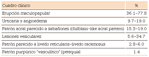 Las manifestaciones clínicas que involucran la piel en pacientes infectados por COVID-19 han sido clasificadas en seis patrones: