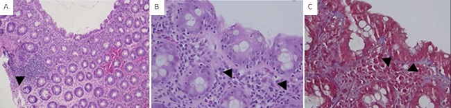 A los siete años, presentó candidiasis oral, disentería, deshidratación grave y choque hipovolémico. Se documentó neutropenia. Se aisló Shigella spp., Giardia lamblia e Hymenolepis nana. Se trató con cefotaxima, metronidazol y nistatina. Por persistir con evacuaciones con sangre macroscópica, se buscó y detectó cinco días después toxina A y B de Clostridium difficile; a través de una colonoscopia, se observó colitis pseudomembranosa y la mucosa colónica ulcerada, en los estudios histopatológicos se observó fusión de criptas, ausencia focal de células caliciformes, infiltración de neutrófilos con destrucción del epitelio glandular, infiltrado linfoplasmocitario (Figura 1). Recibió tratamiento con vancomicina por 7 días con resolución de la sintomatología.