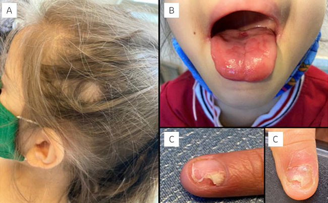 Cinco meses después presentó palidez generalizada, ataque al estado general y fiebre durante dos días; al haber estado en contacto con su madre, quien padeció de la COVID-19, recibió tratamiento a base de azitromicina e ivermectina, con adecuada respuesta. Cuatro semanas después ingresó a urgencias por cefalea, astenia y adinamia; la exploración física mostró alopecia areata (Figura 2A), lengua geográfica (Figura 2B), distrofia ungueal (Figura 2C), úlcera oral y perianal. La biometría hemática resultó con pancitopenia (anemia macrocítica, neutropenia y trombocitopenia), sin embargo, el aspirado de médula ósea fue normal.