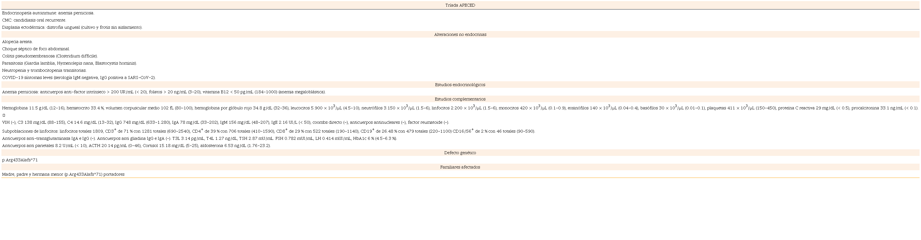 El 80 a 90 % de casos de APECED se han descrito en Finlandia, Cerdeña y judíos iraníes. Predomina en mujeres (relación mujer/hombre 1.5-2.4:1), la edad de inicio de síntomas es entre los 8-14 años, se diagnostica de los 17-20 años y la consanguidad se demuestra en 25 a 50 % de los casos. La CMC se presenta en 80 a 90 % de casos, el hipoparatiroidismo en 70 a 80 % y la insuficiencia suprarrenal en 50 a 60 .5,6 La diversidad en las manifestaciones clínicas está mediada por la presencia de autoanticuerpos contra diferentes órganos endocrinos y no endocrinos por lo que los pacientes pueden cursar con hipogonadismo hipergonadotrópico, diabetes tipo 1, tiroiditis autoinmune o disfunción hipofisiaria. Existen manifestaciones menores como: gastritis crónica, hepatitis autoinmune, hipoplasia del esmalte (85.7 %), vitíligo (37.1 %), queratoconjuntivitis (28.6 %), distrofia ungueal (17.1 %), hipertensión arterial de inicio temprano (17.1 %), asplenia (8.6 %) y nefritis tubulointersticial (5.7 %), menos frecuententemente alopecia (17.1 %) y urticaria, neumonitis y disfunción intestinal en 5 a 20 %.7,8,9,10,11,12,13