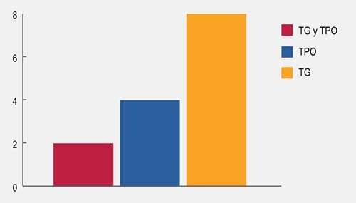 La tiroiditis autoinmune se identificó en 14 pacientes (28 %), todas mujeres, 10 con hipotiroidismo subclínico y cuatro con hipotiroidismo clínico; cuatro (28.6 %) solo fueron positivas a anti-TPO, dos (14.3 %) a anti-Tg y ocho (57.1 %) con positividad a ambos anticuerpos (figura 1).