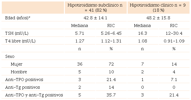 El sexo femenino correspondió a 78 % de la muestra. La media de edad fue de 44.5 ± 15.1 años. Cincuenta de ellos (39 %) presentaron alteraciones en la TSH o T4 libre, 82 % correspondió a hipotiroidismo subclínico y 18 % a hipotiroidismo clínico; no identificamos hipertiroidismo subclínico o clínico (cuadro 1).