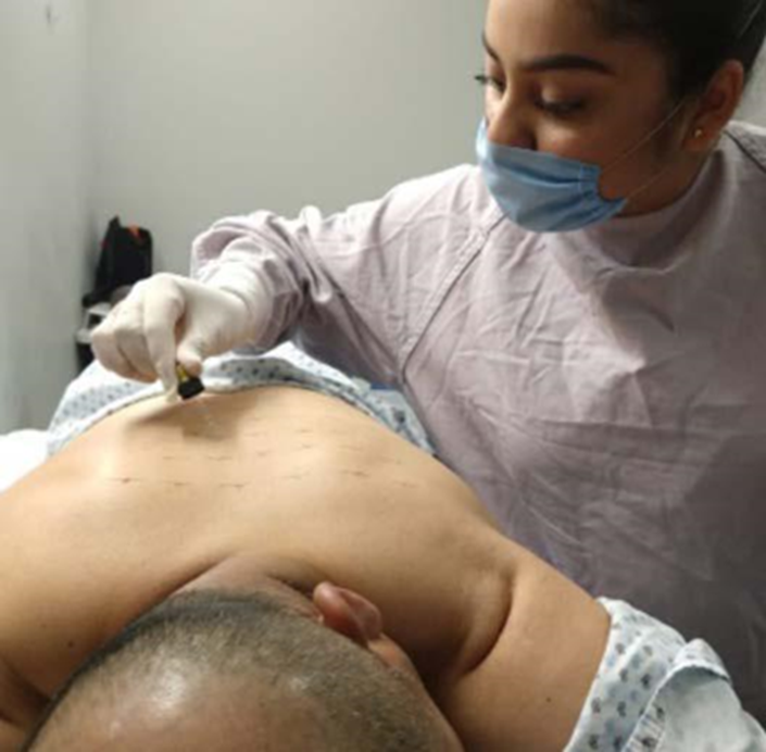 Las pruebas cutáneas se realizaron mediante punción epicutánea (prick), la cual consistió en aplicar una pequeña cantidad de extracto alergénico sobre la piel de los antebrazos o de la espalda del paciente y con una lanceta especial atravesar la gota del extracto hasta llegar a la parte superficial de la piel, consiguiendo la penetración de pequeñas cantidades de extracto alergénico, justo debajo de la epidermis. La lectura se hizo entre los 15 y 20 minutos posteriores a la aplicación, y se consideró un resultado positivo si la pápula resultante medía 3 mm o más que el diámetro mayor de la roncha del control negativo (solución salina glicerinada); para el control positivo se empleó histamina (1:1000). A mayor reacción cutánea, mayor probabilidad de que ese alérgeno tuviera relevancia clínica34 (Figuras 1 y 2).
