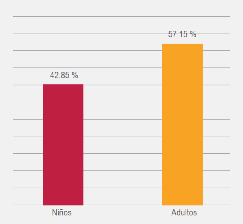 Se estudiaron 1837 pacientes, la prevalencia de reactividad cutánea al antígeno de cucaracha fue de 17.90 % (n = 329), 50.76 % (n=167) correspondió al sexo masculino (Figura 3). De aquellos con reactividad, 42.85 % (n = 141) fue población pediátrica y 57.15 % (n = 188), adulta (Figura 4), con una media de 25.18. Se encontró que 3.91 % de la población total estudiada tenía pruebas positivas para alimentos.