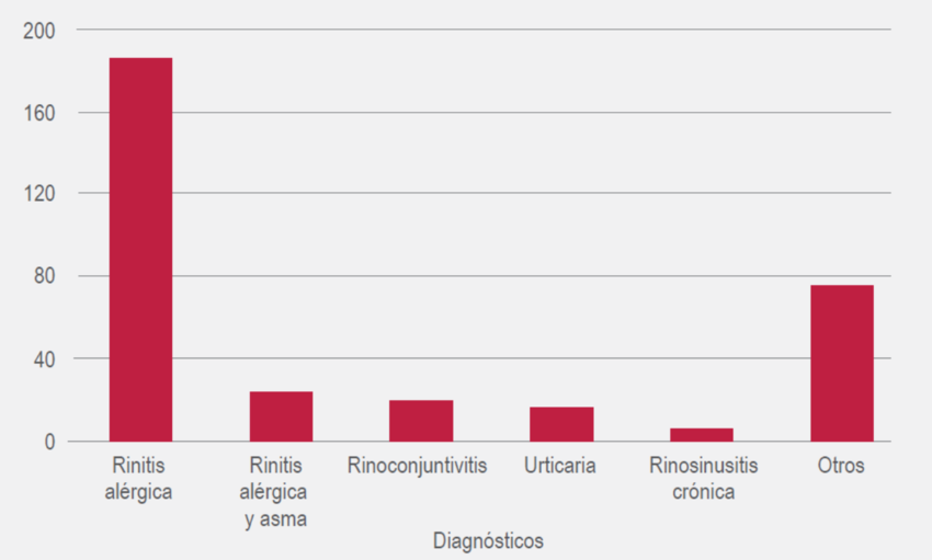 En cuanto a la frecuencia por diagnóstico, se encontraron 186 (56.53 %) pacientes con rinitis alérgica, 24 (7.29 %) con asma y rinitis, 20 (6 %) con rinoconjuntivitis, 17 (5.17 %) con urticaria, seis (1.82) con rinosinusitis crónica y 76 (23.19 %) con otros padecimientos alérgicos (Figura 5).