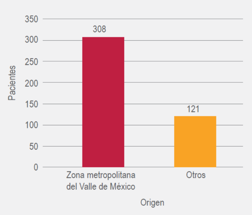 Por distribución geográfica de residencia, 93.62 % (n = 308) de la población estudiada radicaba en la zona metropolitana del Valle de México y el restante 6.38 % (n = 21) provenía de otros estados como Morelos, Guerrero, Hidalgo, Michoacán, Guanajuato, Querétaro, Tabasco, Puebla y Veracruz (Figura 6).