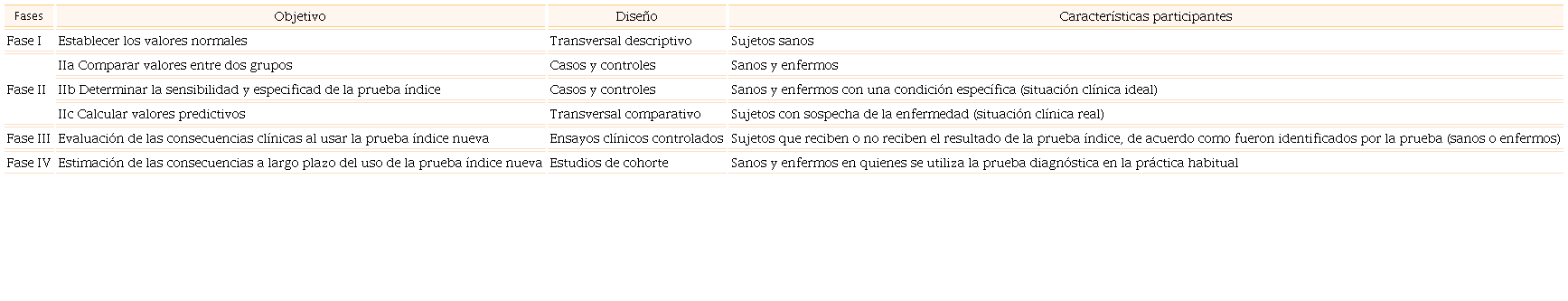 En general se ha establecido que cuatro fases permiten llevar un orden en el conocimiento de la nueva prueba diagnóstica, a partir de ahora referida como “prueba índice”. En las fases iniciales se busca establecer la confiabilidad y validez de la prueba índice para identificar la condición clínica de un paciente, es decir, sano o enfermo; mientras que en las fases posteriores se establece la repercusión en la salud una vez que la prueba índice se aplica en condiciones reales.1,3,5 Hay ciertas variaciones a la propuesta original de esas cuatro fases, las cuales se presentan en el Cuadro 1.