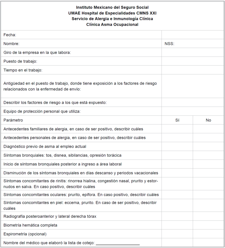A una serie de casos con asma ocupacional se le aplicó un cuestionario en el que como parte de la historia clínica se registra puesto y antigüedad laboral, manifestaciones clínicas y exposiciones a alérgenos (Figura 1). Además, a todos los pacientes se les realizó espirometría y pruebas cutáneas a aerolérgenos; no se realizó reto bronquial. Se incluyeron pacientes con sospecha de asma ocupacional, mayores de 18 años, de uno u otro sexo.